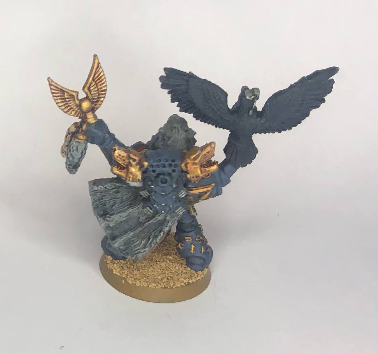 | Even with the wolf's head power pack and the wolfskin and skull and tail, he seems less wolfy than some more modern Space Wolves... |